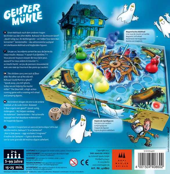 Στο Geistermühle, κάθε παίκτης πρέπει να φέρει τρία χρωματιστά σακιά αλεύρι από τον μύλο στο σπίτι του. Οι παίκτες ξεκινούν από το σπίτι, με το αλεύρι τοποθετημένο σε σχισμές γύρω από έναν υδροτροχό στο ταμπλό του παιχνιδιού. Αυτό το ταμπλό έχει επίσης τρύπες στις οποίες οι παίκτες τοποθετούν τις μαγνητισμένες μάρκες τους καθώς κινούνται. Ένας ξύλινος μυλότροχος με τρεις ενσωματωμένους μαγνήτες βρίσκεται κάτω από αυτό το ταμπλό παιχνιδιού.