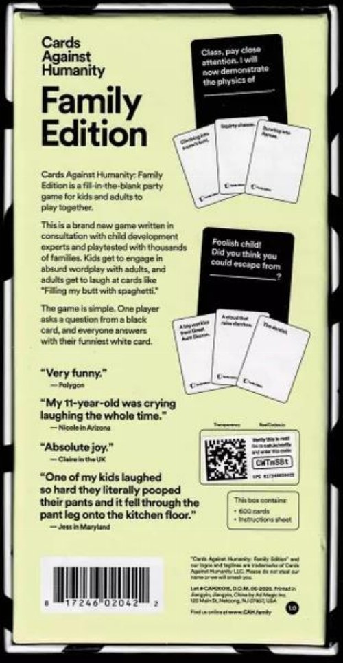 Το Cards Against Humanity: Family Edition είναι ένα νέο παιχνίδι πάρτι που μοιάζει με το Cards Against Humanity, εκτός από το ότι είναι γραμμένο για παιδιά και ενήλικες να παίζουν μαζί. Κάθε γύρο, ένας παίκτης κάνει μια ερώτηση από μια μαύρη κάρτα και όλοι οι άλλοι απαντούν με την πιο αστεία λευκή κάρτα τους.